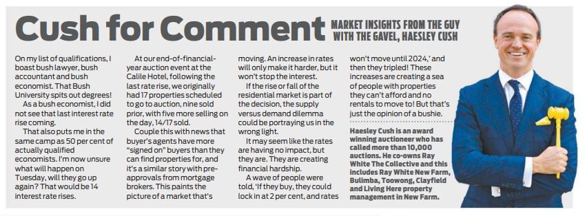 It may seem like the rates are having no impact, but they are. They are creating financial hardship. A wave of people were told, ‘If they buy, they could lock in at 2 per cent, and rates won’t move until 2024,’ and then they tripled! These increases are creating a sea of people with properties they can’t afford and no rentals to move to! But that’s just the opinion of a bushie.