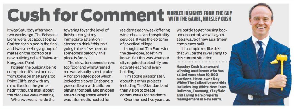 It was Saturday afternoon two weeks ago. The Brisbane Lions were just about to play Carlton for a place in the final and I was meeting a group of mates on the rooftop of a new building called Riviere at Kangaroo Point.