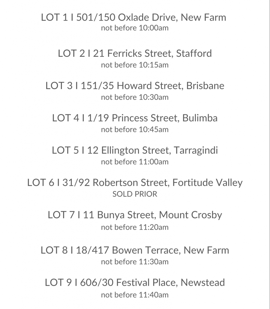 View Order of Sale Booklet HERE SOLD PRIOR 6/63 Mark Street, New Farm 511/25 Duncan Street, West End 1034/36 Evelyn Street, Newstead 528a Lower Bowen Terrace, New Farm View Upcoming Auction Property listings HERE.
